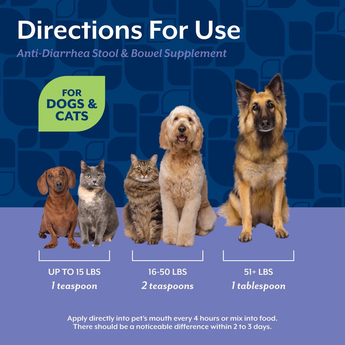 Apply NaturVet Anti-Diarrhea directly into pet's mouth every 4 hours or mix into food. There be a noticeable difference within 2 to 3 days.