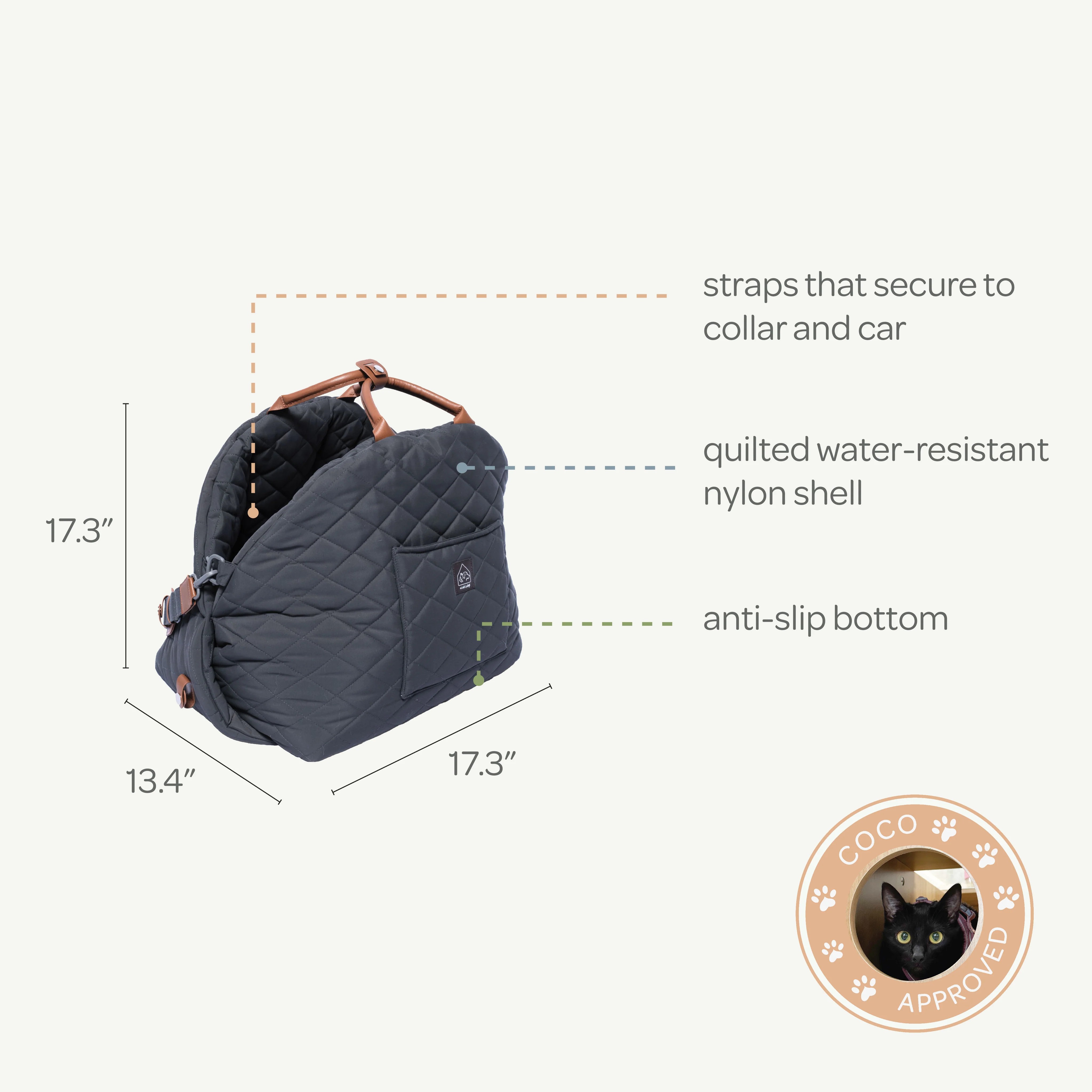 Materials: Water-resistant nylon shell with leash tether