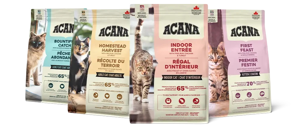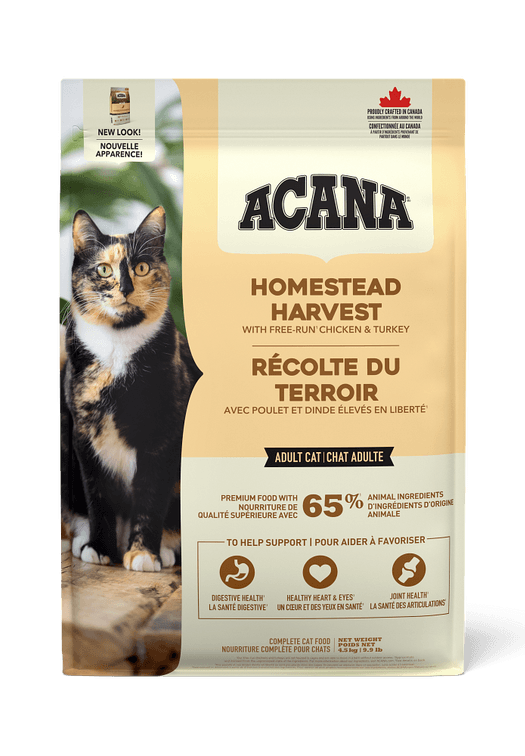 Our ACANA™ Homestead Harvest Recipe satisfies your cat with plenty of protein-rich poultry. Rich with 65% quality animal ingredients1 including free-run2 chicken and turkey, Homestead Harvest is crafted with the animal protein your cat needs to be their best. This nutrient-dense recipe also helps support key health benefits for your cat, including shiny coat & healthy skin, strong muscle & bone maintenance, and healthy digestion & immune system. Nurture your feline with a poultry-rich recipe tailored to keep them healthy and happy with ACANA Homestead Harvest!