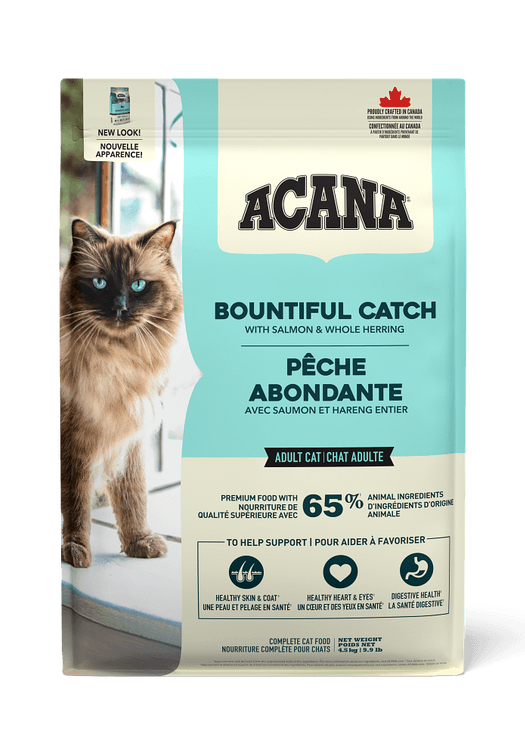 Specially crafted with a bounty of fish, our ACANA™ Bountiful Catch Recipe satisfies your cat with rich fish ingredients. Rich with 65% quality animal ingredients1 including raw salmon and whole herring, Bountiful Catch has the animal protein your cat needs to be their best. This nutrient-dense recipe also helps support key health benefits for your cat, including healthy skin & coat, healthy heart & eyes and digestive health. Nurture your feline with a fish-forward recipe tailored to keep them healthy and happy with ACANA Bountiful Catch!