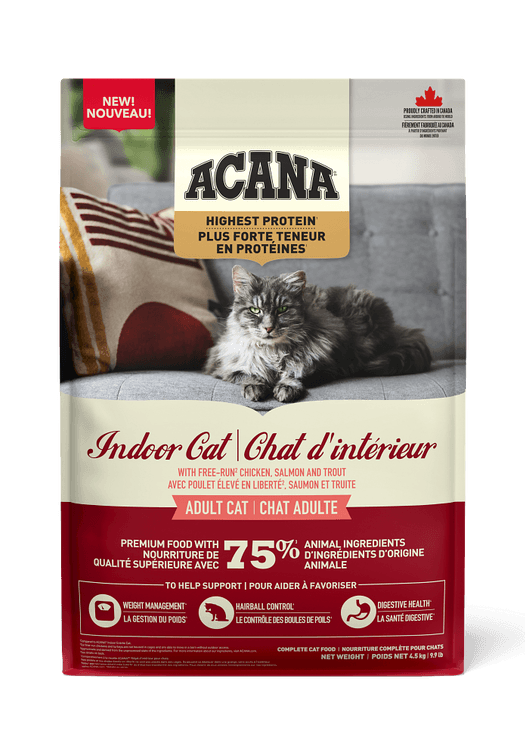 ACANA™ Highest Protein† Indoor Cat recipe is our first no added grains recipe for indoor cats! Rich with free-run1chicken, trout and salmon, this premium recipe is crafted with 75% animal ingredients2 to satisfy your indoor feline’s craving for more protein. To help meet the unique needs of your indoor cat, it helps support 3 unique health benefits, including weight maintenance to help them maintain a healthy weight. A blend of probiotics and fiber help support digestive health and Omega-3 and Omega-6 fatty acids help support a healthy skin and a shiny coat. Nourish your indoor cat’s cravings for more animal protein while supporting their unique needs with ACANA Highest Protein Indoor Cat recipe!