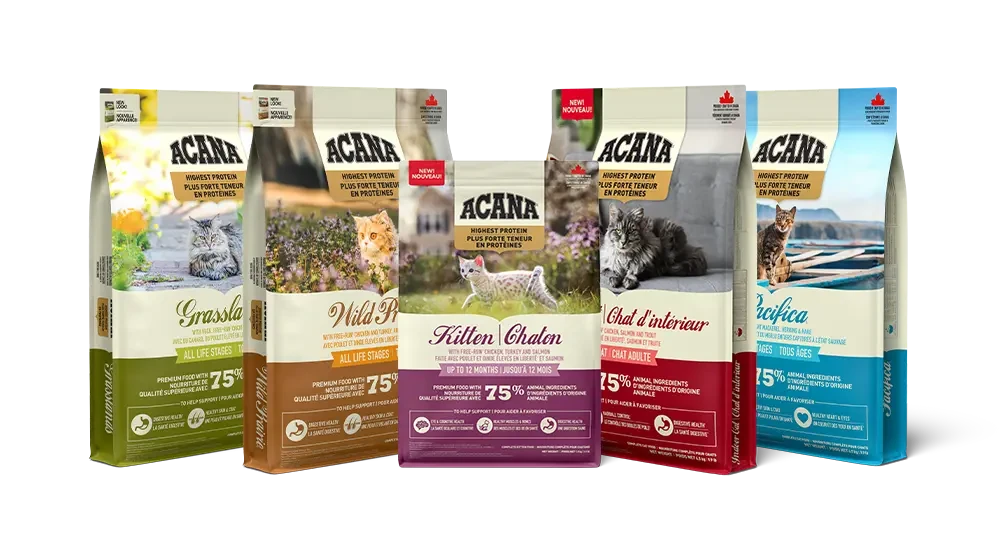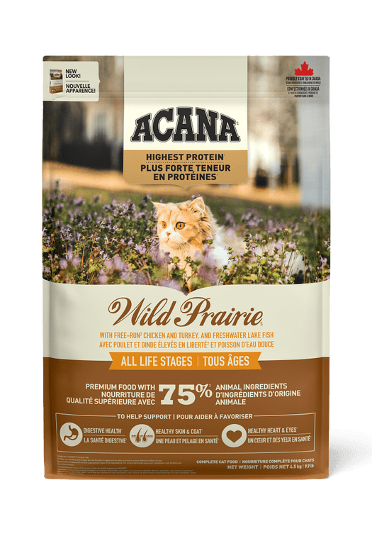 Rich with the highest level of animal protein1, our ACANA™ Highest Protein Wild Prairie Recipe will satisfy your cat completely with its rich poultry ingredients and flavor. Crafted with 75% animal ingredients2 including free-run3 chicken and turkey, and chicken liver, this recipe provides your cat with a variety of nourishing animal protein. This nutrient-dense recipe also helps support key health benefits including your cat’s digestive health, healthy skin & coat, and healthy heart & eyes. Nurture your feline completely with the rich animal protein and nutrition in ACANA Highest Protein Meadowlands Recipe!