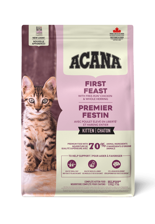 Specially crafted for your kitten, our ACANA™ First Feast Recipe helps support your kitten’s growth and development. Rich with 70% quality animal ingredients1 including fresh or raw free-run2 chicken and whole herring, First Feast has the animal protein your kitten needs to grow up strong. This nutrient-dense recipe also helps support key health benefits for your kitten, including healthy skin and coat, healthy muscles and bones, and eye and brain development. Nurture your kitten with a recipe tailored to help them grow up healthy and happy with ACANA First Feast!