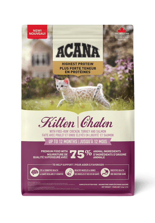 Nurture your growing kitten with more animal protein in ACANA™ Highest Protein Kitten recipe. Perfect for kittens up to 12 months old, this premium recipe is rich with 75% animal ingredients* including free-run** chicken, turkey, and salmon to satisfy and nourish your young feline. Our nutritious ingredients also help support the healthy development of your kitten, including healthy heart & eyes and digestive health. See your kitten grow up healthy and strong with protein-rich recipe crafted specially for their needs.