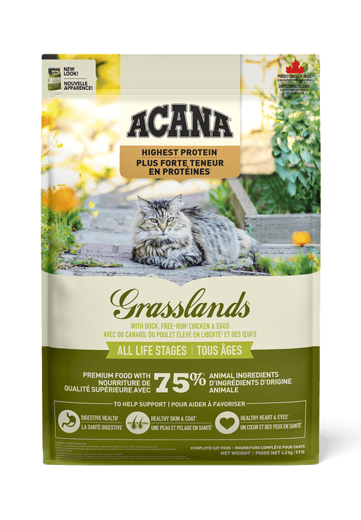 Rich with the highest level of animal protein1, our ACANA™ Highest Protein Grasslands Recipe will satisfy your cat completely with its rich duck and poultry ingredients and flavour. Crafted with 75% animal ingredients2 including duck, free-run3 chicken and turkey, and eggs , this recipe provides your cat with a variety of nourishing animal protein. This nutrient-dense recipe also helps support key health benefits including your cat’s digestive health, healthy skin & coat, and healthy heart & eyes. Nurture your feline completely with the rich animal protein and nutrition in ACANA Highest Protein Grasslands Recipe!