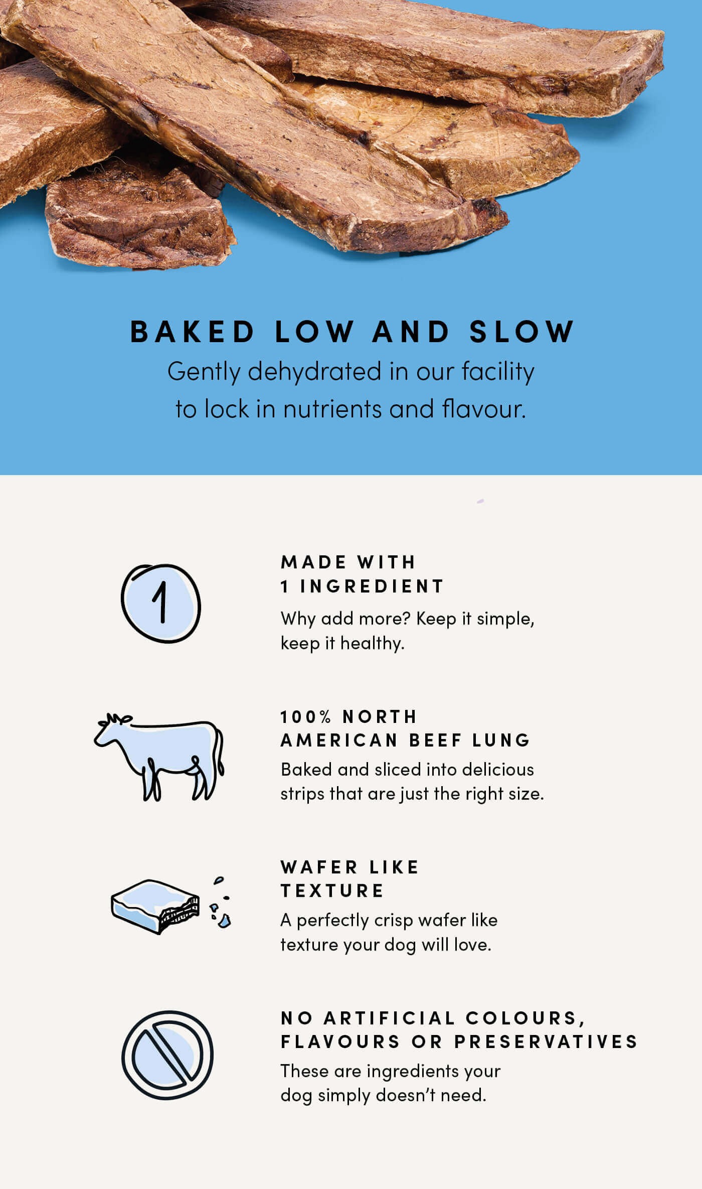 They are baked low & slow to gently dehydrate them while locking in all of the nutrients and flavour. With no artificial colours, flavours or preservatives these all natural Canadian treats have a texture that makes them easy to break apart making them a great option for dogs of all ages and sizes.