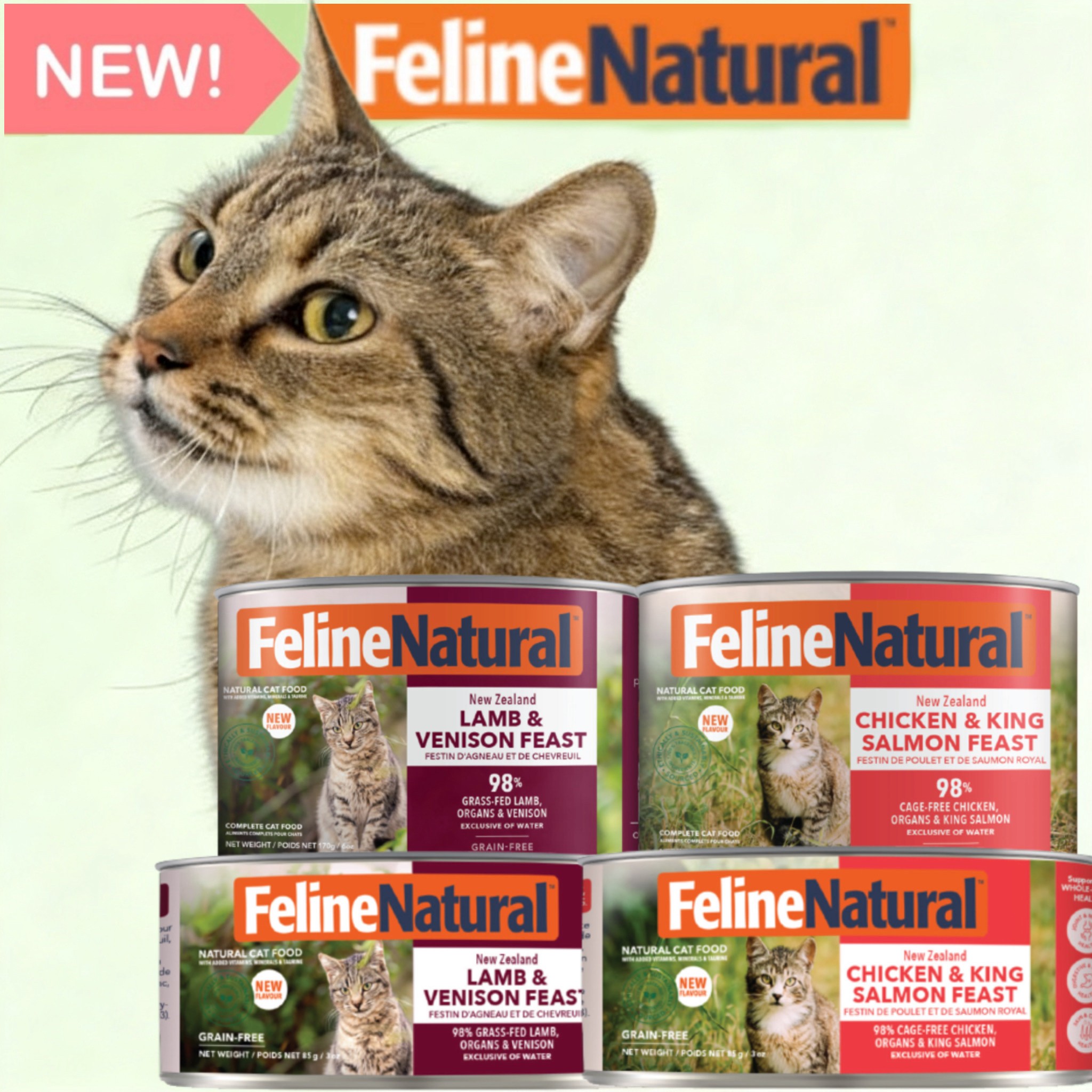 Our complete and balanced New Zealand Lamb & Venison Feast Cans contain 98% Grass-fed & Grass-finished Lamb, Venison and Organs, with New Zealand Green Lipped Mussels, Vitamins, Minerals and Taurine in support of your cat's whole-body health.