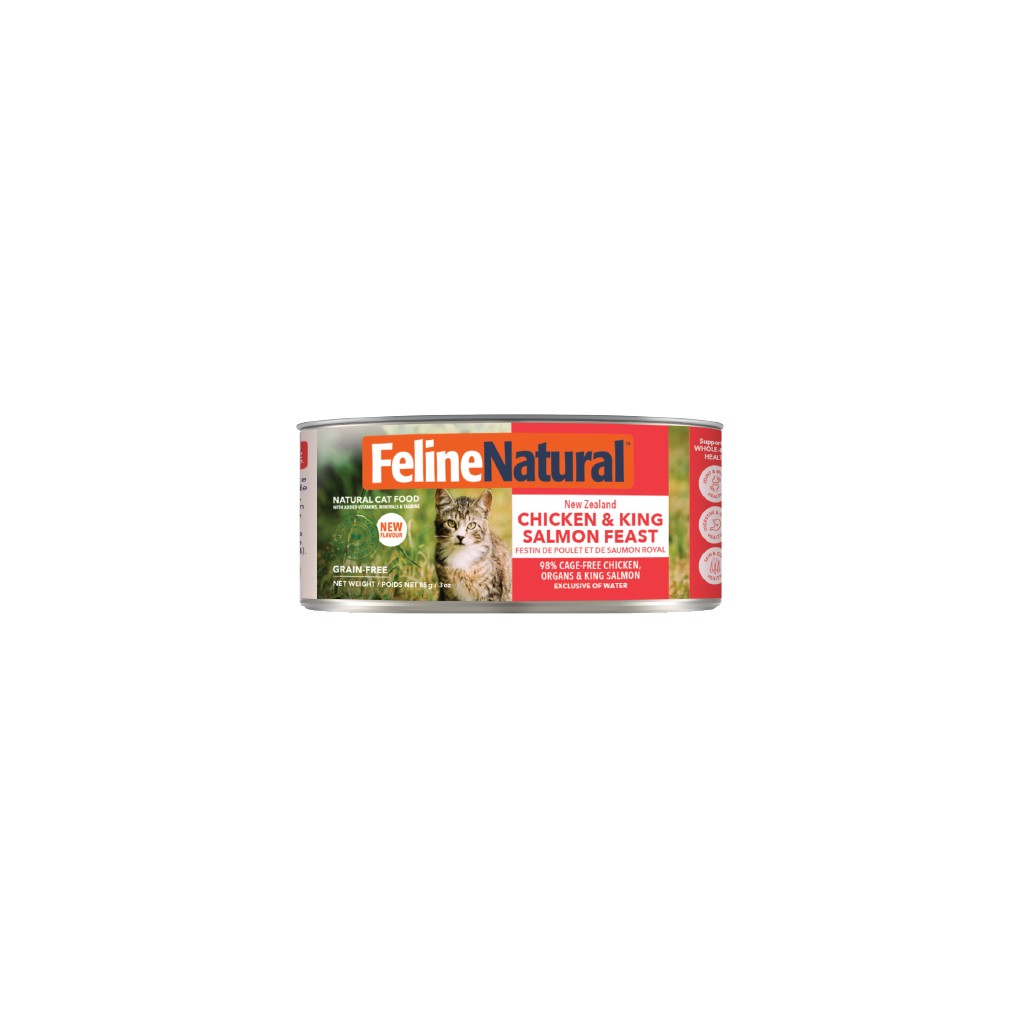 Our complete and balanced Chicken & King Salmon Feast Cans contain 98% Cage-Free Chicken & Organs and Sustainably Farmed Salmon, with Green Lipped Mussels, Vitamins, Minerals and Taurine in support of your cat's whole-body health.