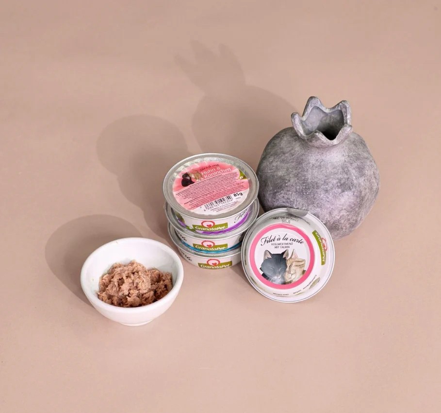 Our GranataPet Filet à la carte with Tuna & Turkey offers your cat a delicious meal with tender pieces of fillet. The extra juicy recipe is a culinary delight for even the most demanding cats and, thanks to high-quality salmon oil, not only ensures a shiny coat but also supports the immune system with our unique pomegranate seeds. This is a delicious treat that no velvet paw will want to miss out on.