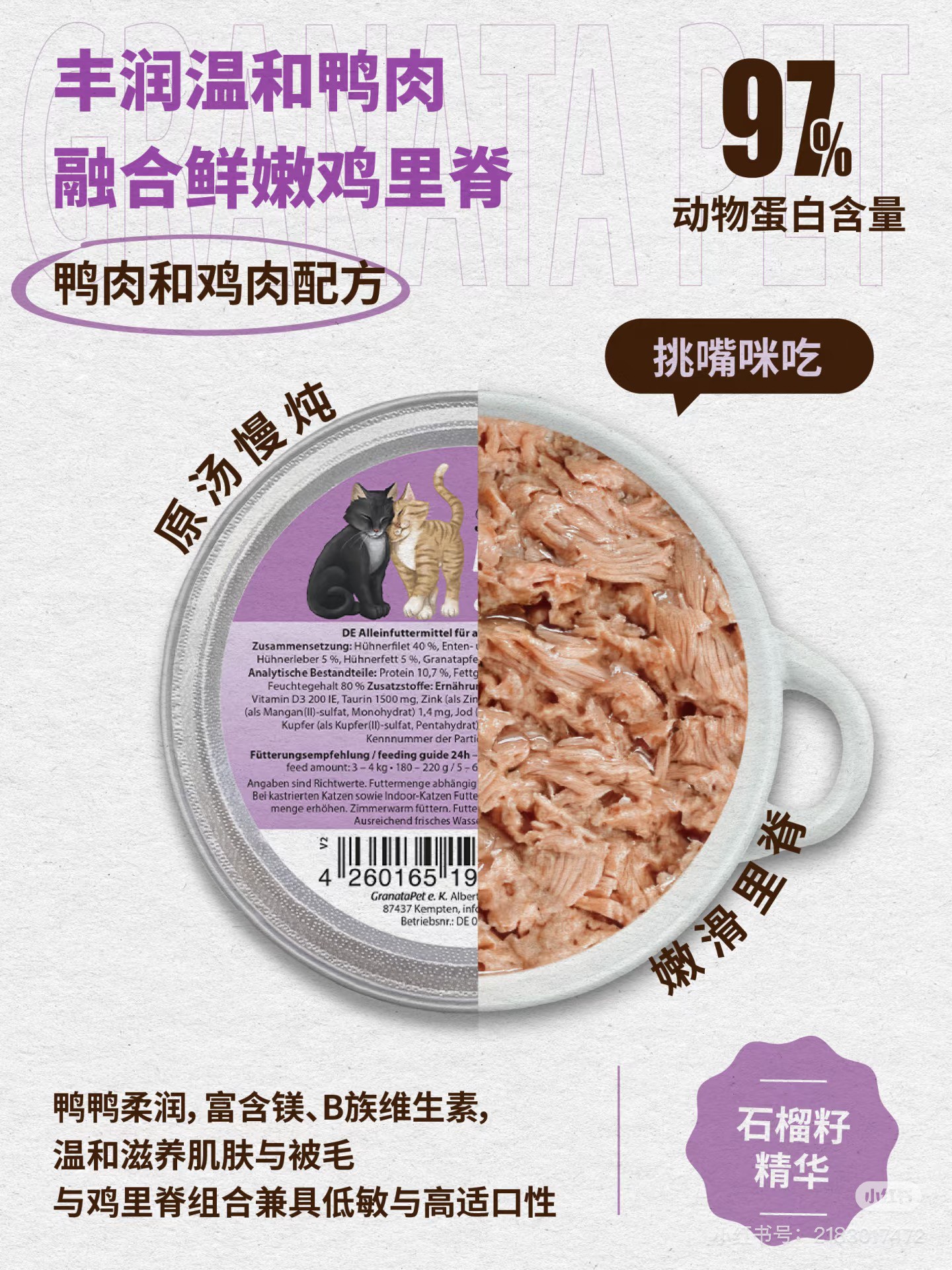 GranataPet Filet à la carte with duck & chicken is a tasty complete meal made from tender pieces of filet. The recipe is refined with high-quality salmon oil and pomegranate seeds. Gently cooked in its own stock, this first-class natural wet food is particularly tasty and easily digestible. The salmon oil protects your cat's skin and ensures a silky, shiny coat. There are also minerals, taurine and other vitalizing ingredients that make the succulent menu a balanced wholefood diet.