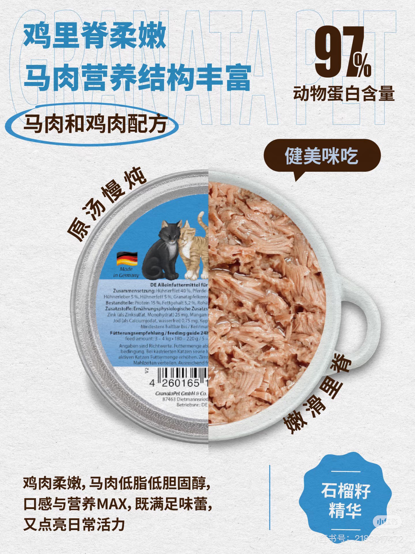 chicken filet 40 %, horse and chicken broth 37 %, horse hearts 10 %, chicken liver 5 %, chicken fat 5 %, pomegranate seeds 1 %, salmon oil 1 %, mineral nutrients 1 %