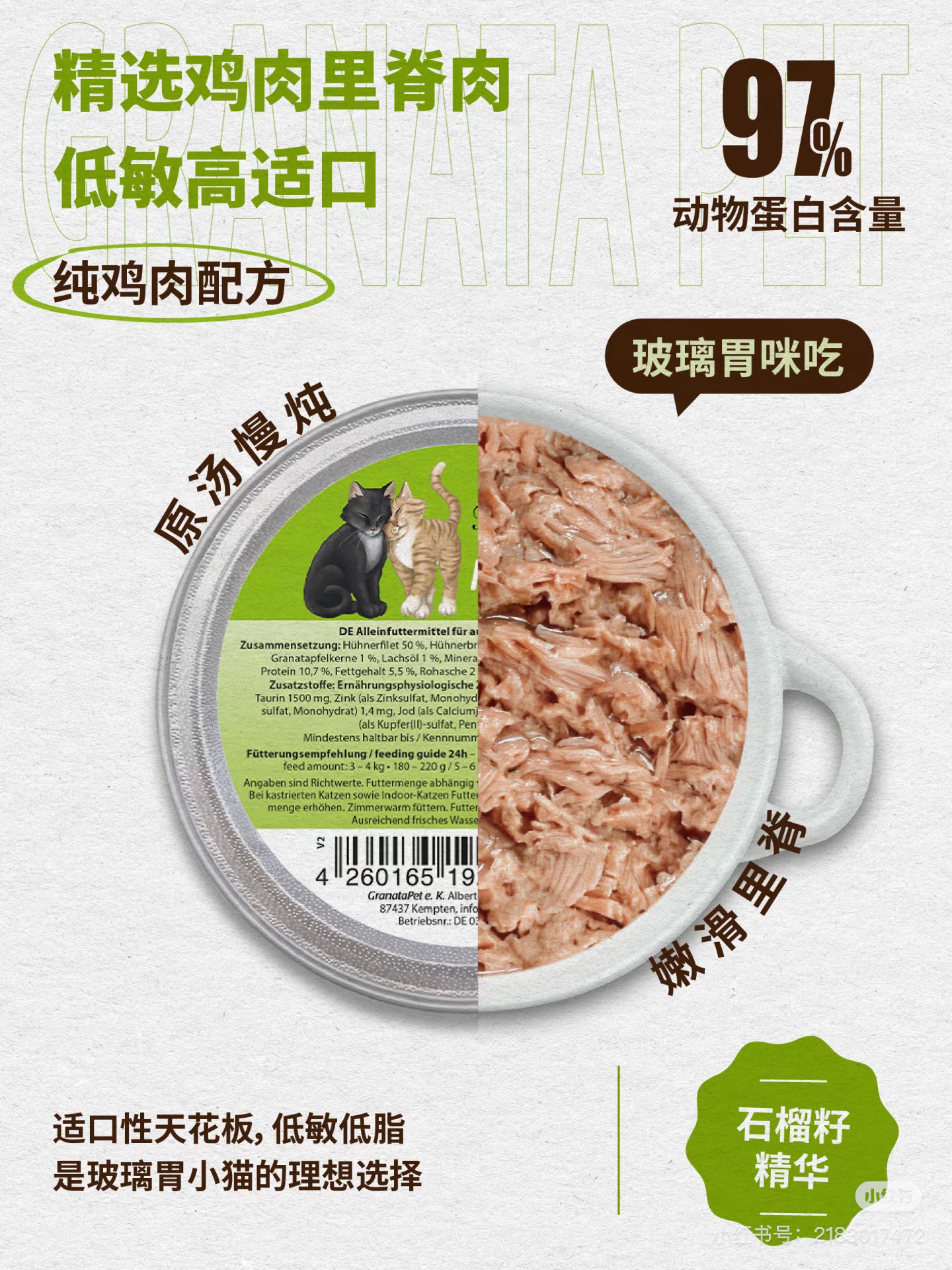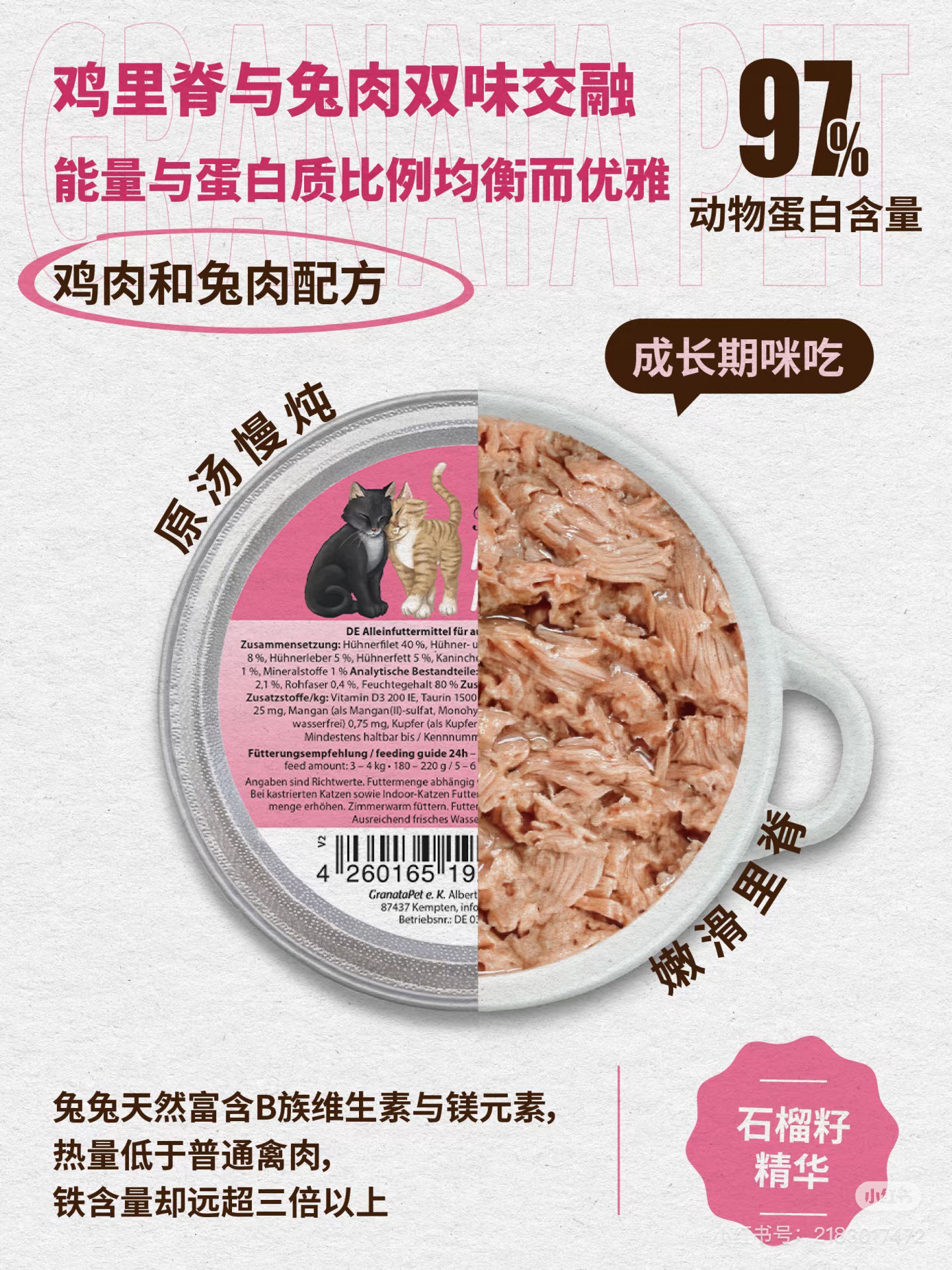 GranataPet Filet à la carte with chicken & rabbit is a tasty complete meal made from tender pieces of fillet. The recipe is refined with high-quality salmon oil and pomegranate seeds. Gently cooked in its own stock, this first-class natural wet food is particularly tasty and easily digestible. The salmon oil protects your cat's skin and ensures a silky, shiny coat. There are also minerals, taurine and other vitalizing ingredients that make the succulent menu a balanced wholefood diet.