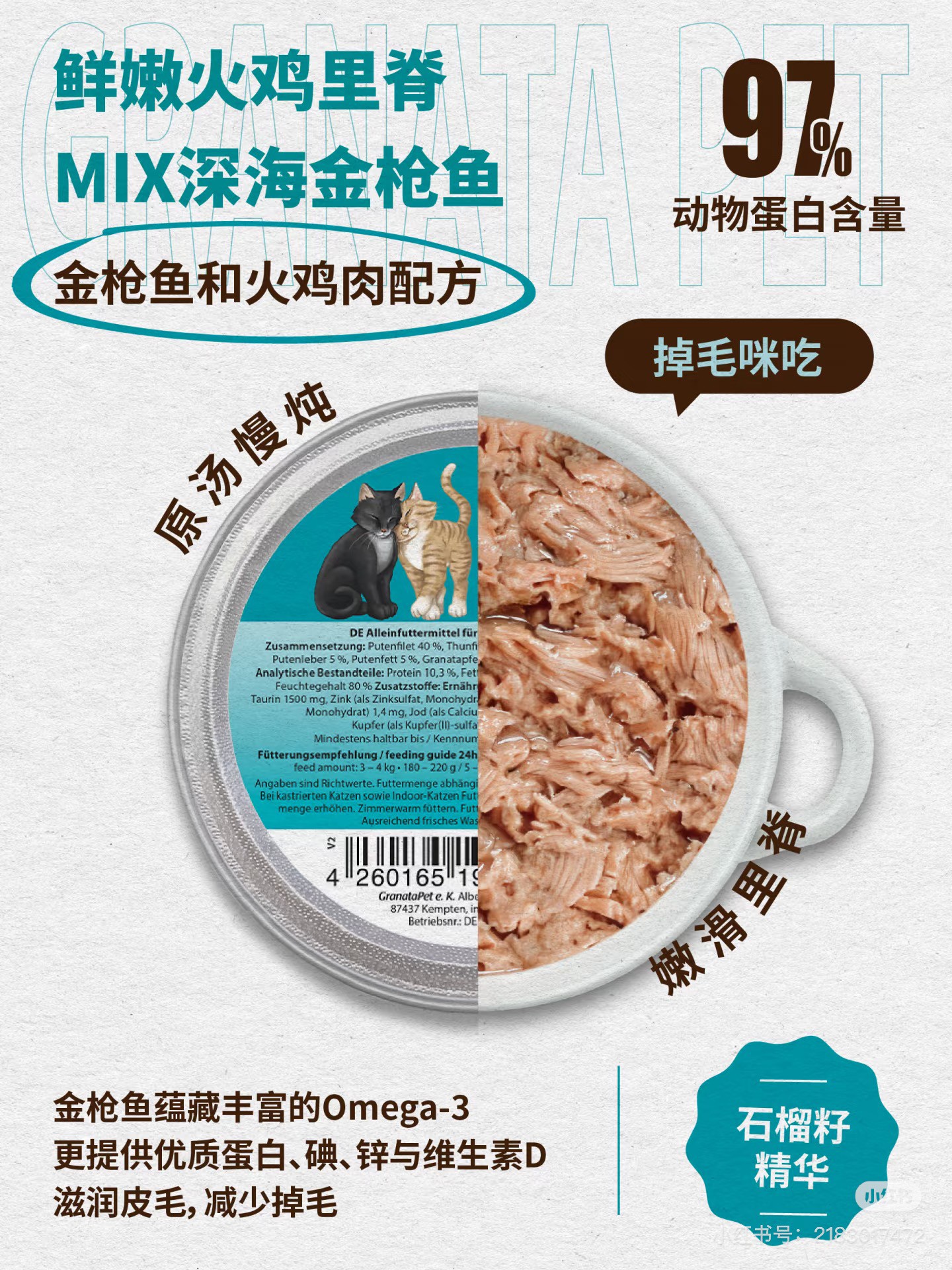 turkey filet 40 %, tuna and turkey broth 37,9 %, tuna 10 %, turkey liver 5 %, turkey fat 5 %, pomegranate seeds 0,1 %, salmon oil 1 %, mineral nutrients 1 %