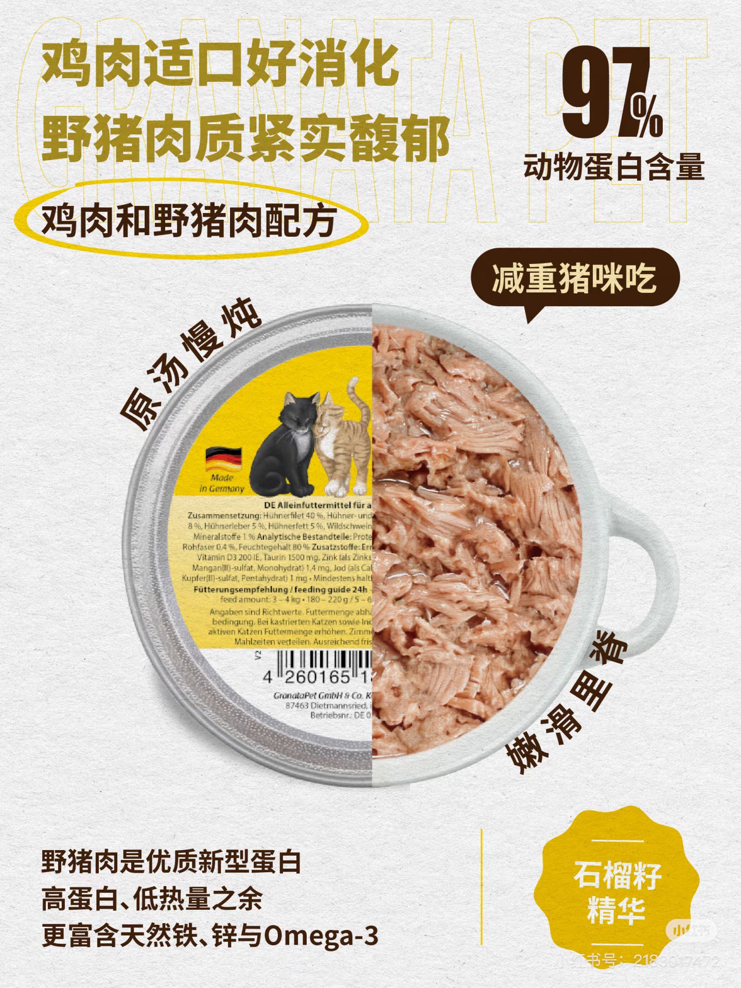 chicken filet 40 %, chicken and wild boar broth 37 %, wild boar hearts 8 %, chicken liver 5 %, chicken fat 5 %, wild boar liver 2 %, pomegranate seeds 1 %, salmon oil 1 %, mineral nutrients 1 %