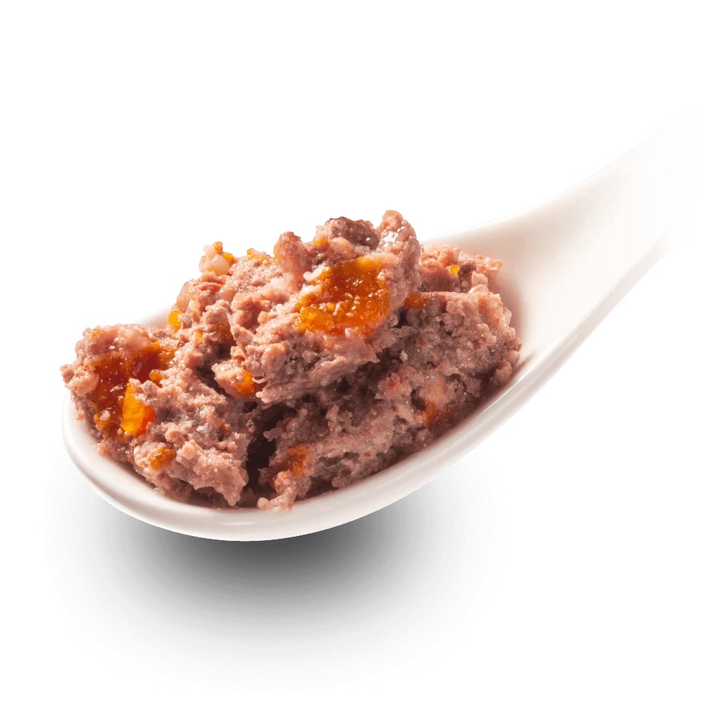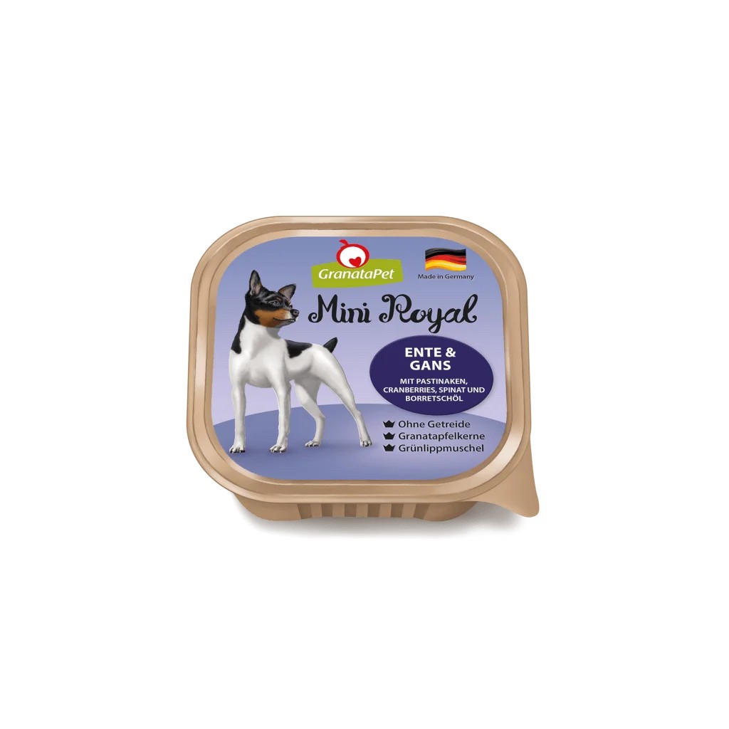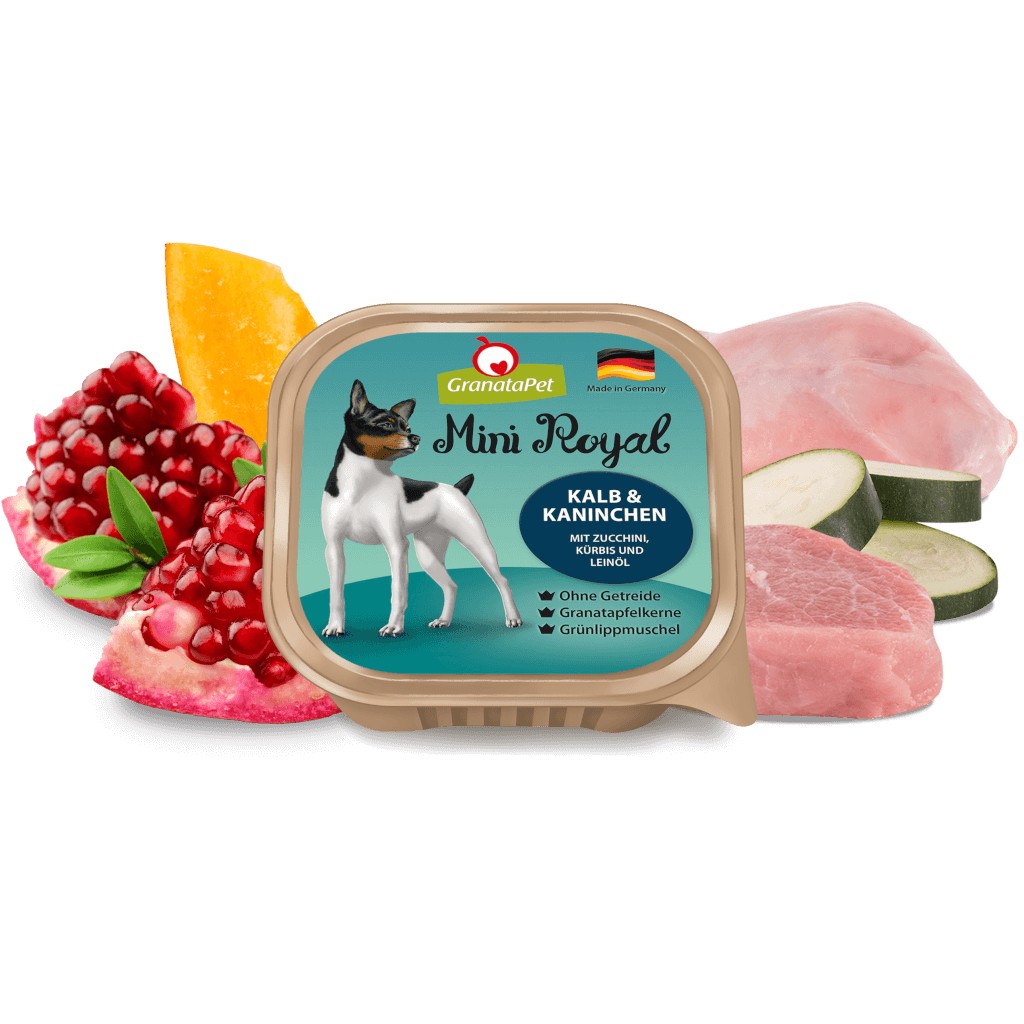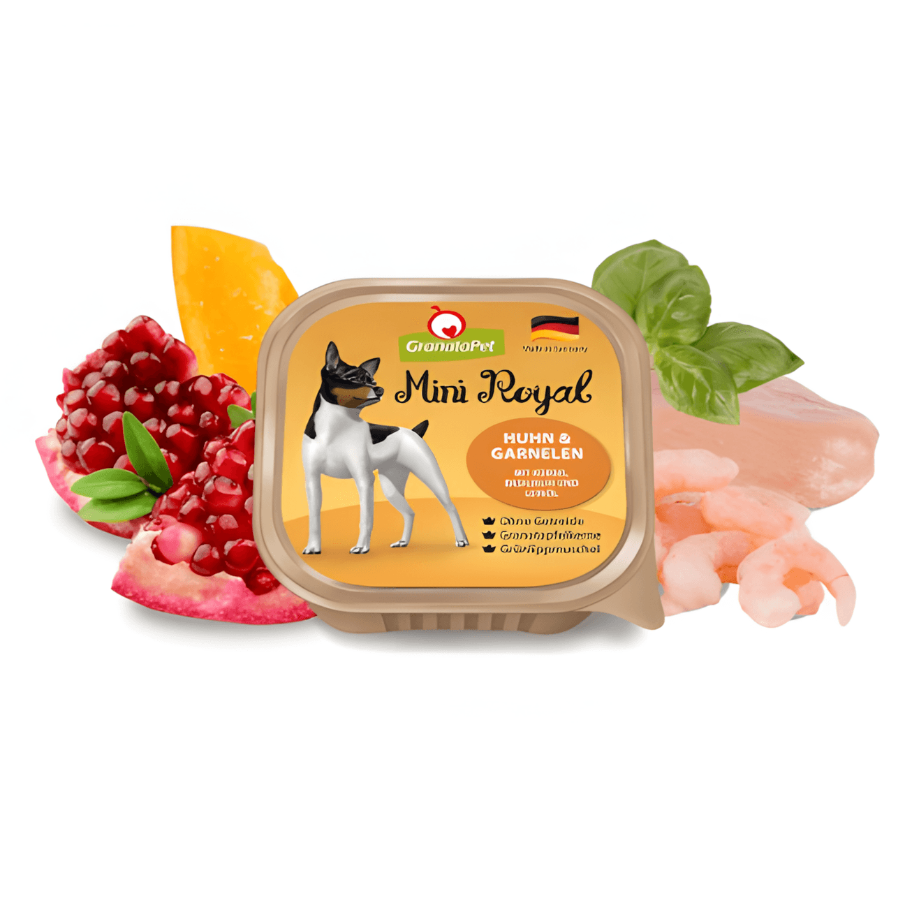 GranataPet Mini Royal wet food is the "royal" whole food for small breed dogs. This high-quality, protein-rich wet food contains plenty of fresh meat, vegetables, fruit, and valuable oils. The menu is enhanced with New Zealand green-lipped mussel for joint protection and select, soothing herbs. Thanks to the naturalness of the selected ingredients and the balanced recipe, Mini Royal is easily digestible.