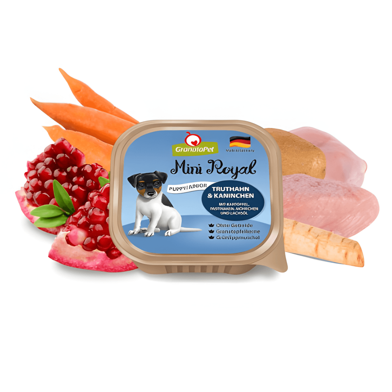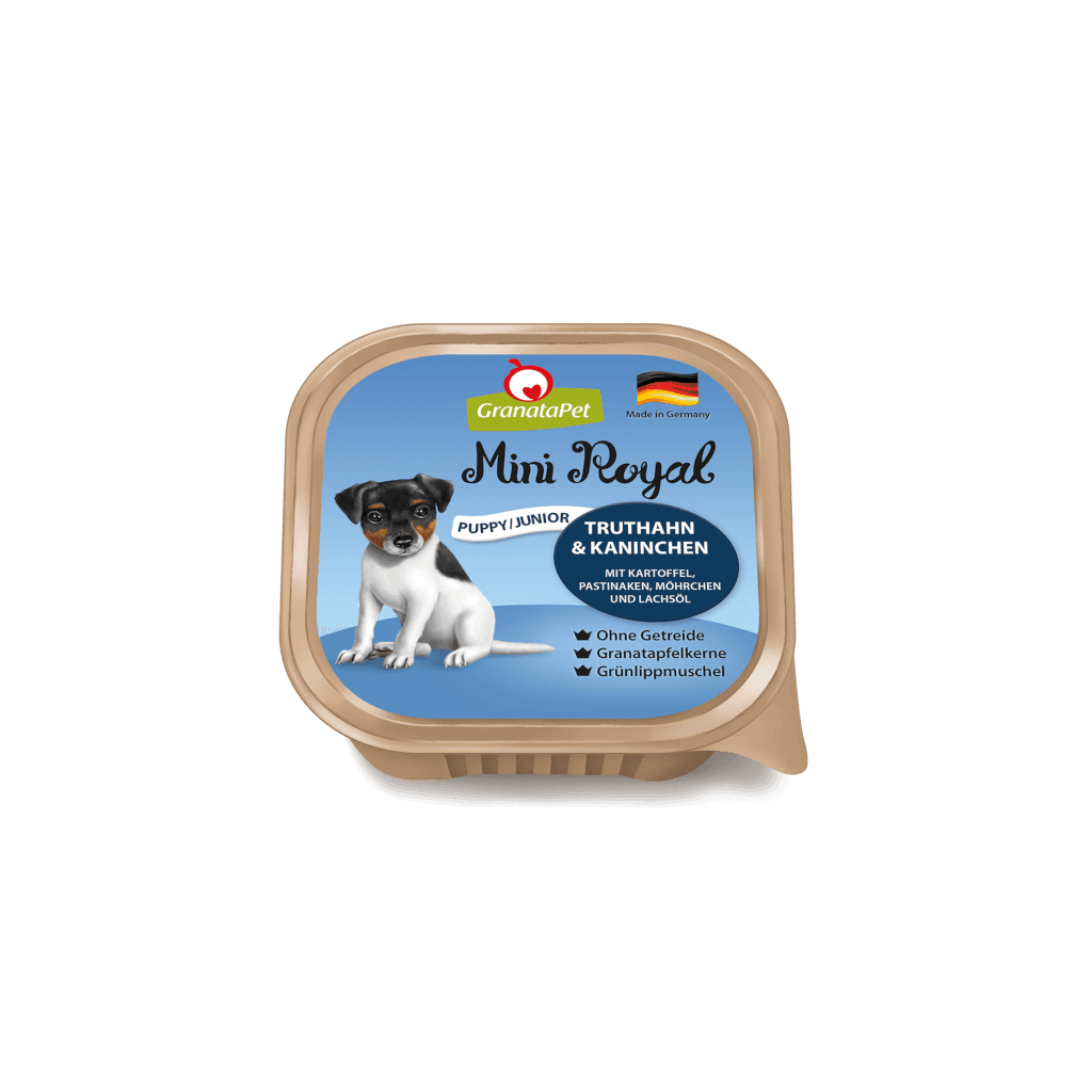 GranataPet Mini Royal Turkey & Rabbit Junior with potatoes, parsnips, carrots and salmon oil offers a tasty diet for your growing dog up to the age of 10 months. Thanks to the high proportion of high-quality meat, your pet is optimally nourished in a natural way. This provides the young and growing organism with everything it needs. The products are all developed by us without animal testing and manufactured in Germany. The gentle manufacturing process ensures that the ingredients retain their natural vitamins and nutrients.