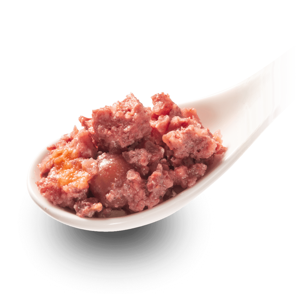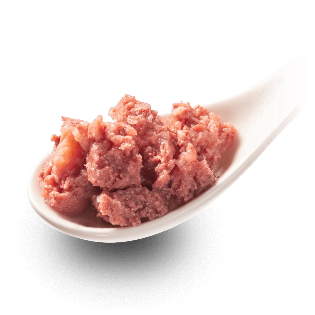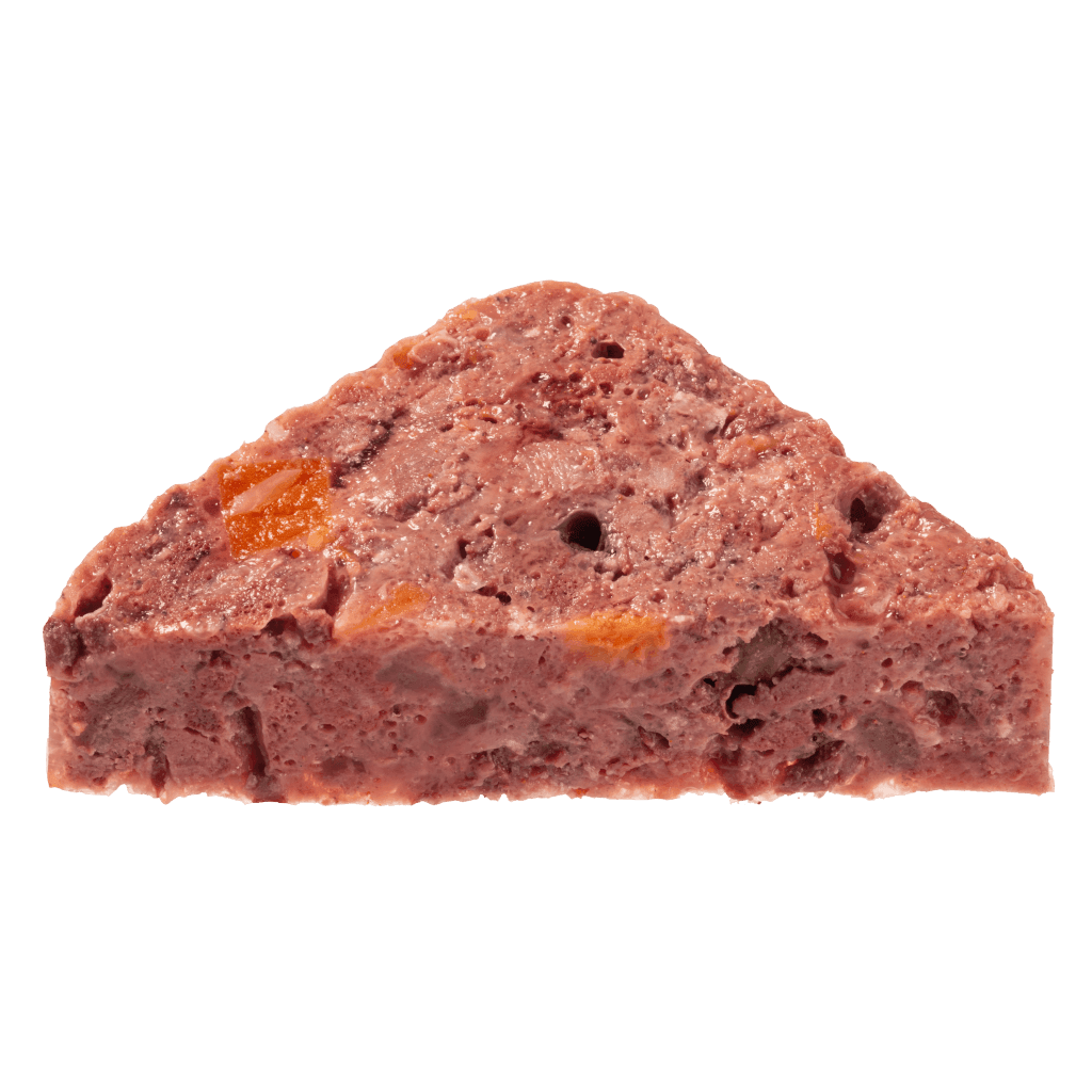 venison meat and angus beef meat 65 % (venison 50 % consisting of muscle meat, heart, liver, lung and angus beef 15 % consisting of muscle meat, heart, liver, lung), venison and angus beef broth 24,4 %, sweet potato 5 %, cranberry 3 %, pomegranate seeds 1 % (dried and finely ground), mineral nutrients 1 %, sunflower oil 0,5 %, green-lipped mussel 0,1 % (finely ground, naturally rich in glucosamin and chondroitin)
