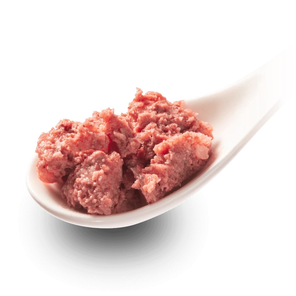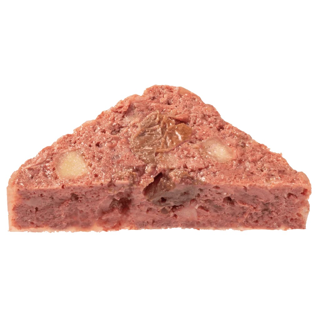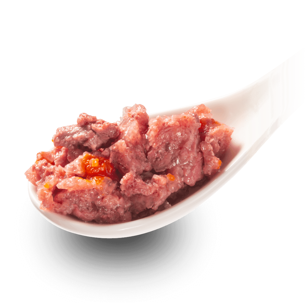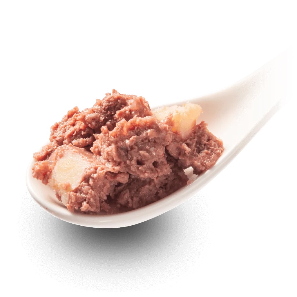 venison meat and angus beef meat 65 % (venison 50 % consisting of muscle meat, heart, liver, lung and angus beef 15 % consisting of muscle meat, heart, liver, lung), venison and angus beef broth 24,4 %, sweet potato 5 %, cranberry 3 %, pomegranate seeds 1 % (dried and finely ground), mineral nutrients 1 %, sunflower oil 0,5 %, green-lipped mussel 0,1 % (finely ground, naturally rich in glucosamin and chondroitin)
