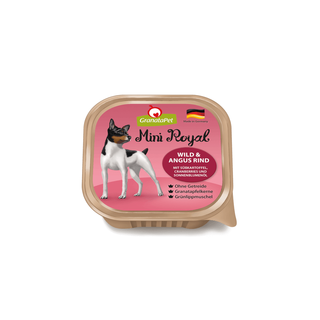 GranataPet Mini Royal Wild & Angus Beef with sweet potato, cranberries and sunflower oil offers a species-appropriate and nature-orientated diet especially for small dog breeds with a final weight of up to 10kg. The menu contains only ingredients that are easy for dogs to digest and utilise. The products are all developed by us without animal testing and manufactured in Germany. The gentle manufacturing process ensures that the ingredients retain their natural vitamins and nutrients.