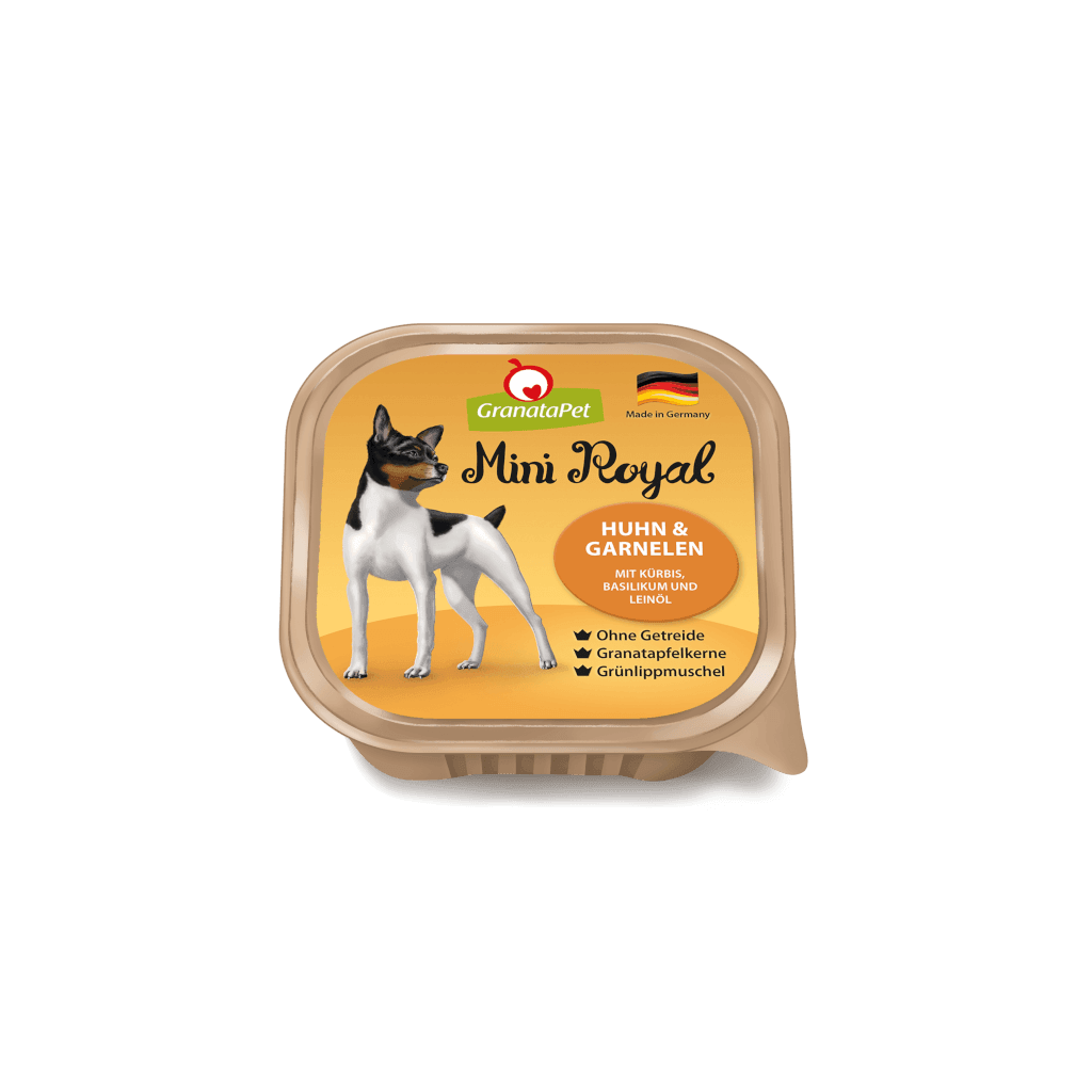 GranataPet Mini Royal Chicken & Prawns with pumpkin, basil and linseed oil offers a species-appropriate and nature-orientated diet especially for small dog breeds with a final weight of up to 10kg. The menu contains only ingredients that are easy for dogs to digest and utilise. The products are all developed by us without animal testing and manufactured in Germany. The gentle manufacturing process ensures that the ingredients retain their natural vitamins and nutrients.