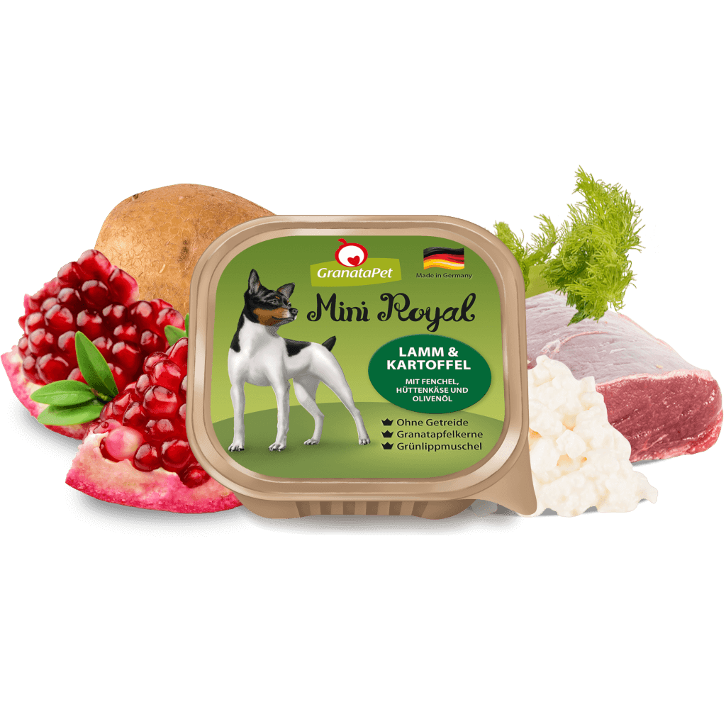 GranataPet Mini Royal Lamb & Potato with Fennel, Cottage Cheese and Olive Oil offers a species-appropriate and nature-orientated diet especially for small dog breeds with a final weight of up to 10kg. The menu contains only ingredients that are easy for dogs to digest and utilise. The products are all developed by us without animal testing and manufactured in Germany. The gentle manufacturing process ensures that the ingredients retain their natural vitamins and nutrients.