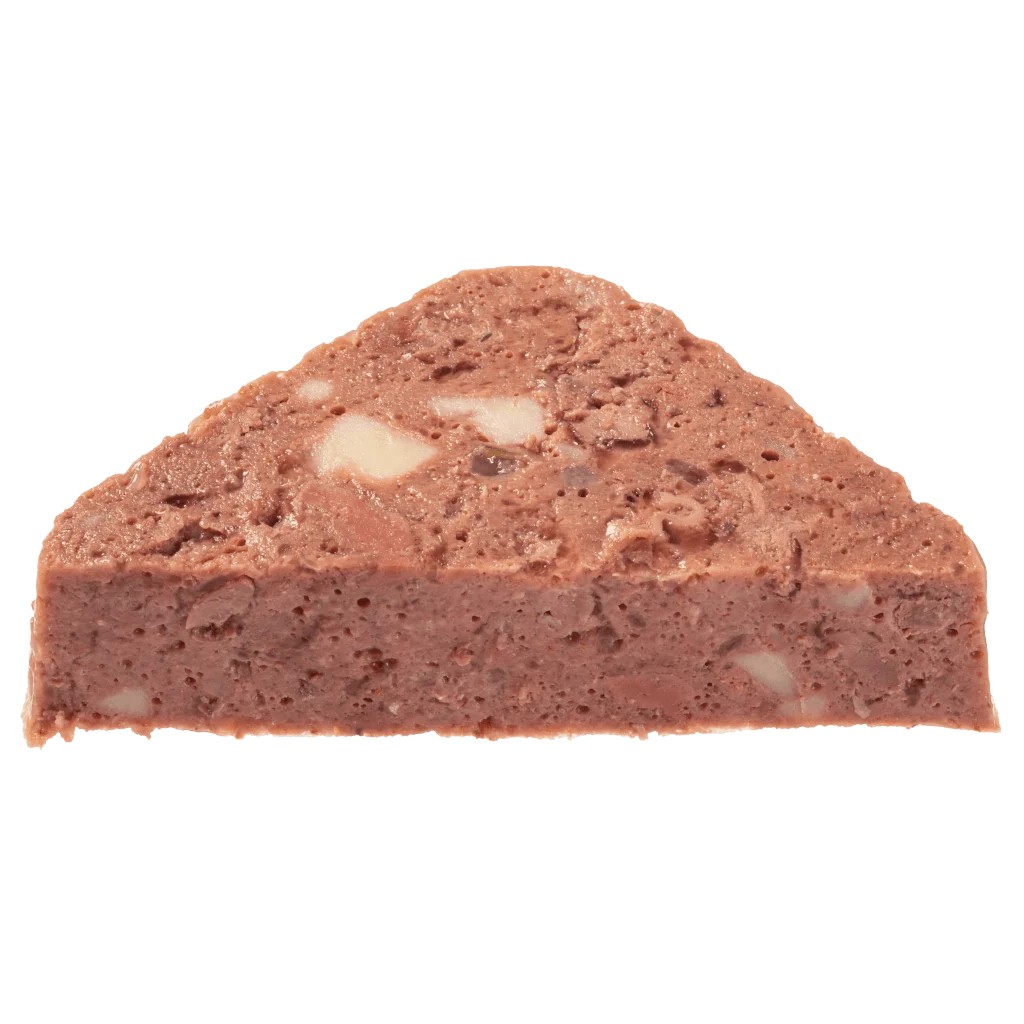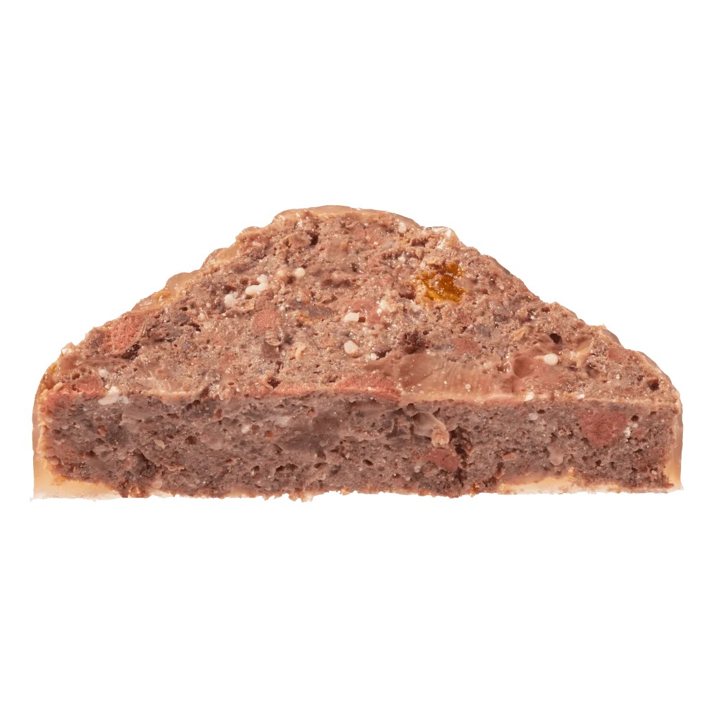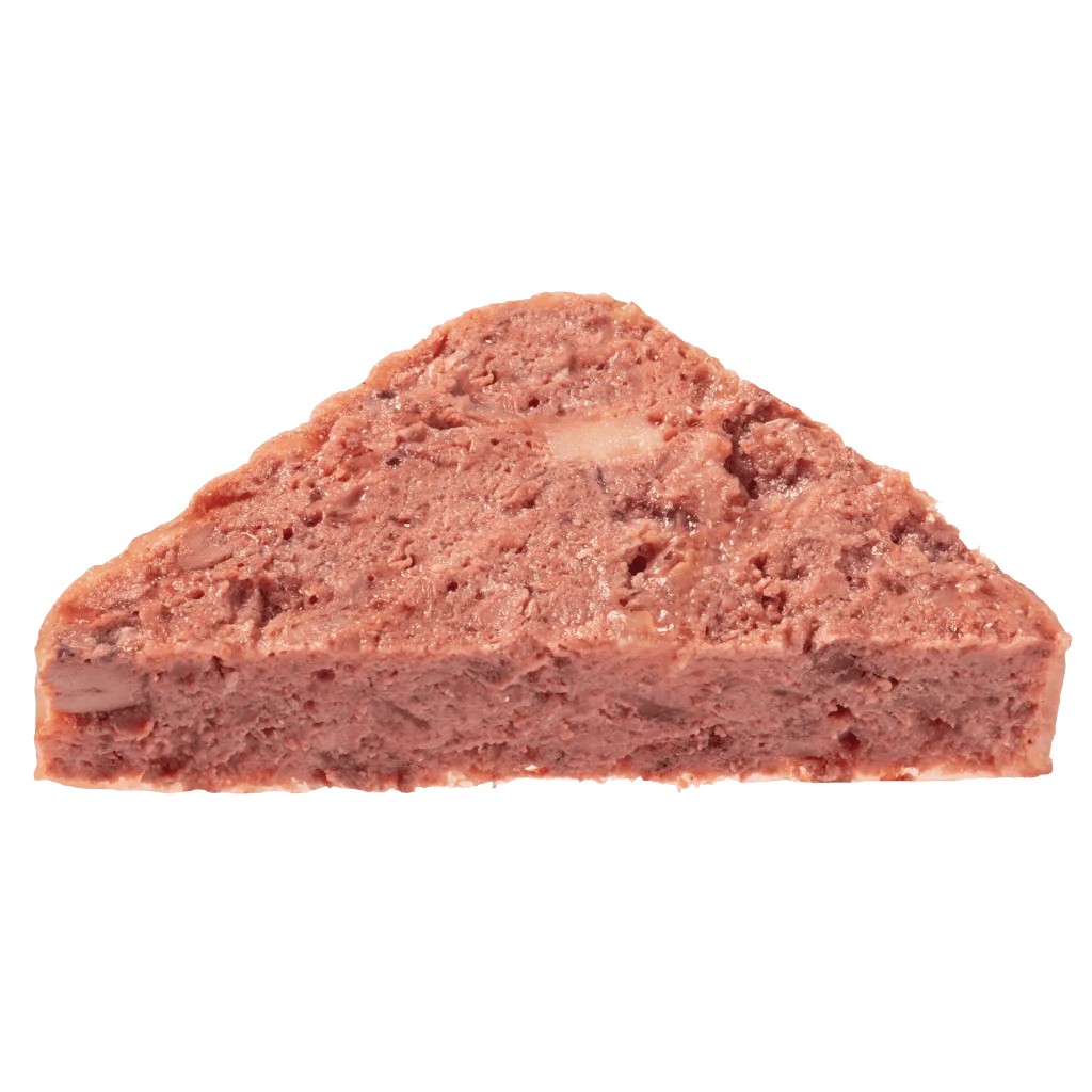 veal meat and coney meat 65% (veal 40% consisting of muscle meat, heart, liver, lung, paunch and coney 25% consisting of muscle meat, heart, liver), veal and coney broth 24,4%, courgette 5%, pumpkin 3%, pomegranate seeds 1% (dried and finely ground), mineral nutrients 1%, linseed oil 0,5%, green-lipped mussel 0,1% (finely ground, naturally rich in glucosamin and chondroitin)