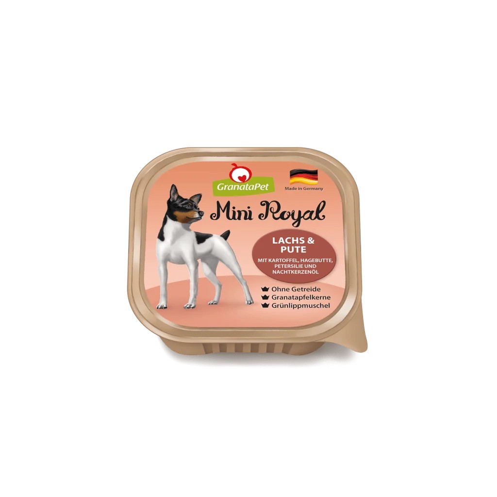 GranataPet Mini Royal Salmon & Turkey with potato, rosehip, parsley and evening primrose oil offers a species-appropriate and nature-orientated diet especially for small dog breeds with a final weight of up to 10kg. The menu contains only ingredients that are easy for dogs to digest and utilise. The products are all developed by us without animal testing and manufactured in Germany. The gentle manufacturing process ensures that the ingredients retain their natural vitamins and nutrients.