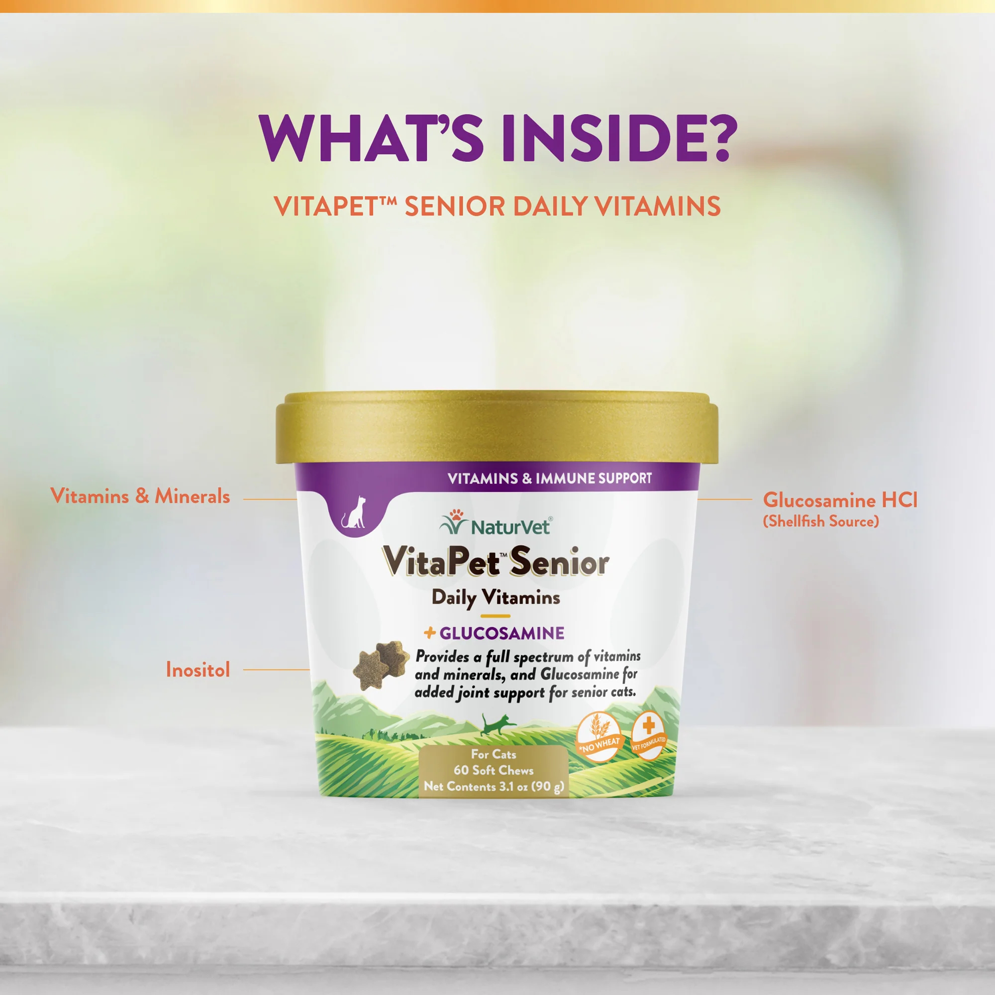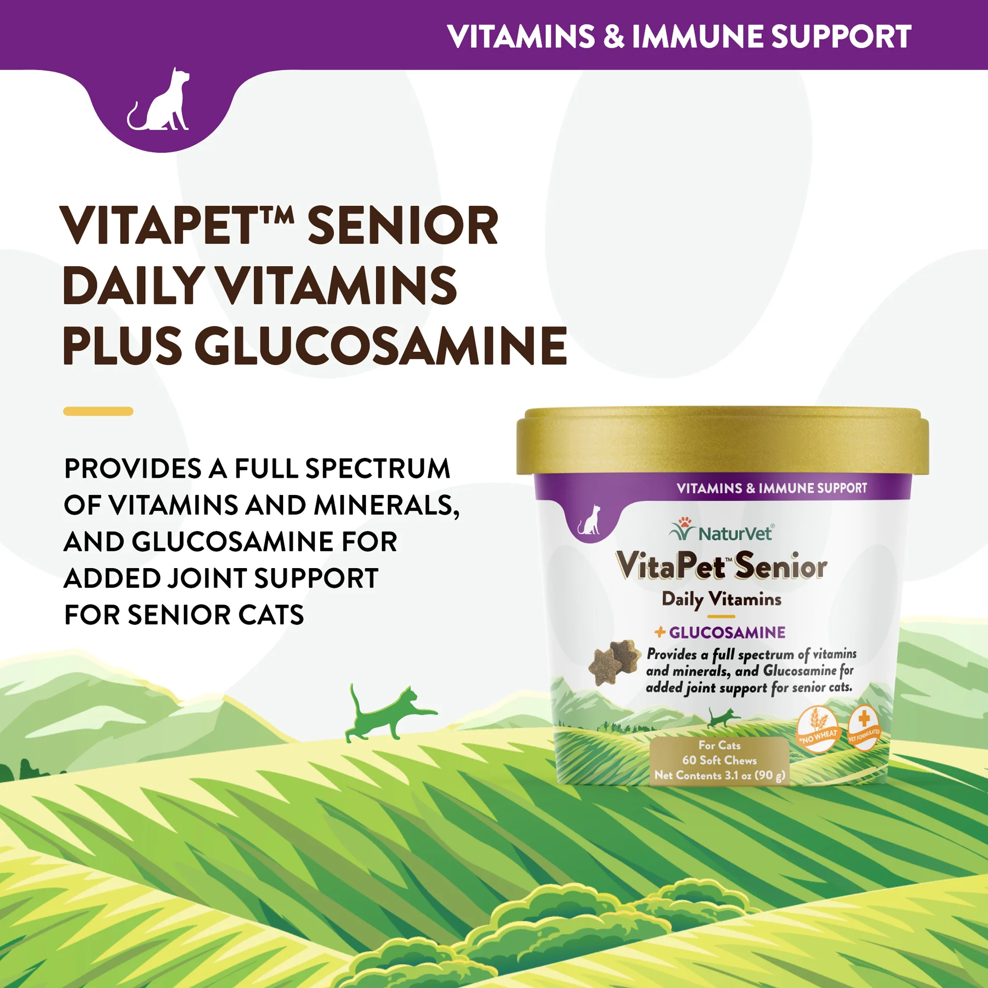 VitaPet™ 老年猫每日维生素软咀嚼片适合老年猫使用,但 12 周以上的猫也可以使用。提供日常饮食中可能缺少的维生素和矿物质。